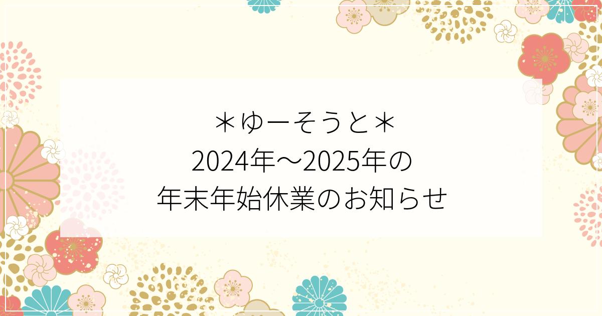 powerd by : https://usortblog.com/easy-eyecatch-creator 2024年~2025年の年末年始休業のお知らせです。 ゆーそうとでは 2024/12/28(土)~2025/1/5(日) までを